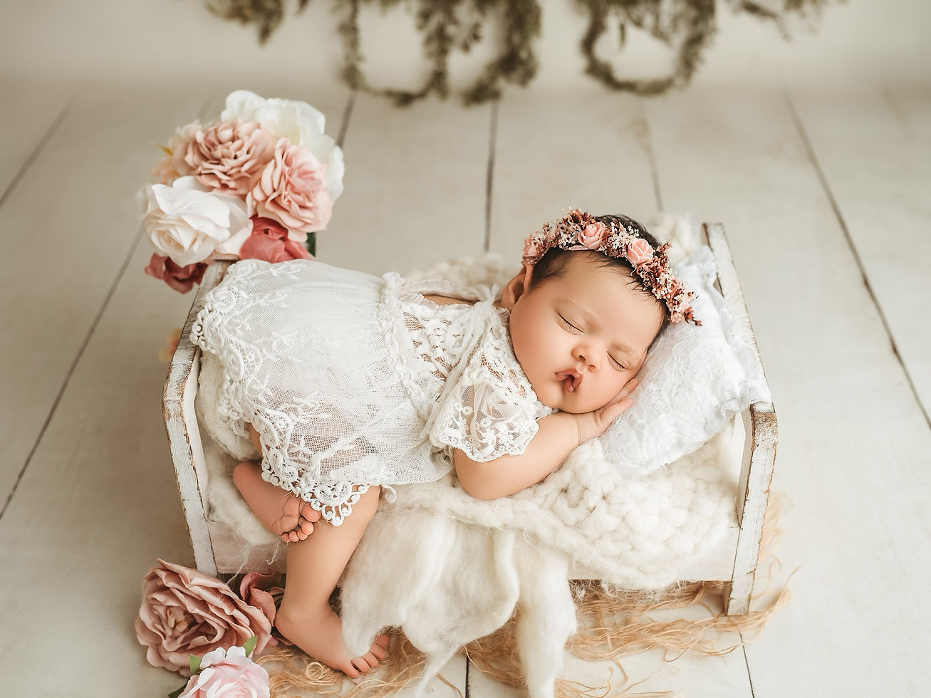 My newborn sessions take place in my cozy, fully equipped photography studio in Luton. The space is designed to be warm, safe, and peaceful — a calming environment for both baby and parents. Everything you need is already here: props, blankets, wraps, headbands and outfits.